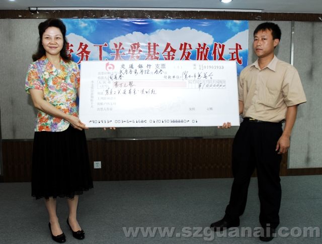 市政協副主席陳觀光(左)為勞務工家屬發放關愛基金
