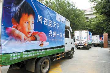 市“關愛辦”副主任吳慧艷介紹說,“深圳市學生愛心捐助”活動源于《深圳商報》的一篇報道。20069月,一名來自廣東省連州市的打工青年到《深圳商報》熱線新聞部求助,希望通過報紙發出呼吁,向深圳市民募集舊書籍送往他的家鄉,為缺少課本和課外讀物的學生送去精神食糧。《深圳商報》的報道在市民中引起極大反響,不少熱心市民提著成捆成箱的書籍來到報社捐書。一些愛心企業義務組織運輸隊伍將募捐來的書籍送到山區,假期出游的市民也成了捐書活動的“搬運車隊”。一年來,先后有5趟運送書籍的車隊奔赴河源、梅州等地。
