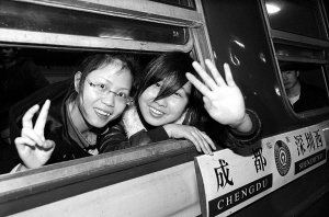 昨晚7時15分,富士康集團專門組織的滿載員工的60輛大巴來到深圳西站,在深圳西站站長李飛躍等組織下,車站為他們開通“綠色通道”,安排專人舉牌引導,為外來工提供檢票、進站、上車的“一條龍”服務。僅僅15分鐘,乘車農(nóng)民工就幾乎全部進入列車車廂。站臺上寒氣逼人,車廂內(nèi)卻暖意融融,大家臉上都洋溢著回鄉(xiāng)的喜悅。湖南懷化籍女工舒芳芳坐在座位上說:“以前買火車票要排隊,還不一定買得到,今年沒想到能夠乘坐專列回家。”據(jù)列車員介紹,列車主要途經(jīng)湖南、四川兩個農(nóng)民工大省,明天16時18分到達終點站成都。
