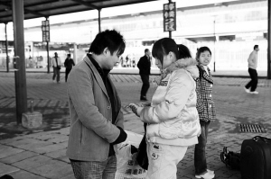 上午8時(shí),售票點(diǎn)開門了,李波終于又看到希望。可買票的隊(duì)伍似乎過長,總也不往前挪動(dòng)一下。看到李波渴望的眼神,記者找到售票處經(jīng)理,向他反映了李波的情況,經(jīng)理當(dāng)即保證李波的回家車票沒問題。10時(shí)30分,當(dāng)李波接過K586次開往南充的火車座票時(shí),眼圈有些泛紅。