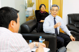 胡文龍、林崇德夫婦接受記者采訪。本報記者 廖萬育 攝