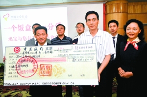 昨天上午,深圳迅寶環(huán)保股份有限公司董事長(zhǎng)劉關(guān)清向深圳關(guān)愛行動(dòng)組委會(huì)辦公室主任、深圳報(bào)業(yè)集團(tuán)社長(zhǎng)黃揚(yáng)略遞交了捐建“媽媽食堂”的首期啟動(dòng)資金50萬(wàn)元。劉關(guān)清董事長(zhǎng)鄭重承諾:“迅寶公司正式推出一個(gè)飯盒一分愛,共建‘媽媽食堂’愛心活動(dòng),今后迅寶公司每銷售一個(gè)迅寶環(huán)保飯盒就捐出一分錢,用于隴南災(zāi)區(qū)‘媽媽食堂’的建設(shè)以及困難學(xué)生的生活資助。”