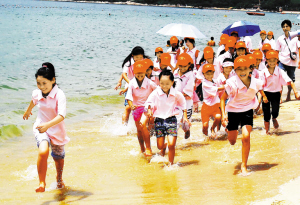 孩子們第一次見到大海,在海水中盡情奔跑。