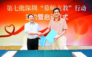 (本網(wǎng)訊) 6月23日,第七批深圳“募師支教”行動(dòng)簽約暨啟動(dòng)儀式在深舉行,深圳市關(guān)愛辦主任、深圳報(bào)業(yè)集團(tuán)黨組書記、社長(zhǎng)黃揚(yáng)略代表主辦方,與贊助方深圳中航集團(tuán)股份有限公司董事長(zhǎng)吳光權(quán)正式簽署《深圳市第七批“募師支教”公益合作協(xié)議書》,標(biāo)志著深圳關(guān)愛行動(dòng)品牌項(xiàng)目——“募師支教”再次啟動(dòng)。由深圳中航集團(tuán)出資100萬元人民幣、獨(dú)家贊助的第七批“募師支教”行動(dòng),從即日起面向全國(guó)公開招募80名支教志愿者,他們將分赴甘肅隴南、江西井岡山和廣西等地的山區(qū)學(xué)校,支教一個(gè)學(xué)期。深圳報(bào)業(yè)集團(tuán)副總編、深圳商報(bào)副總編李南玲主持了“募師支教”行動(dòng)簽約儀式。