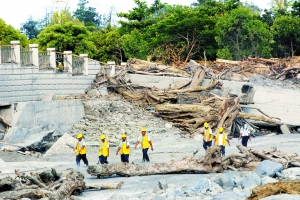 8月19日,救援人員在臺灣太麻里災區準備清理隨洪水沖下來的漂流木。新華社發