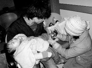 家住福田的張女士是位兩歲孩子的媽媽。昨天,她在家中看了本報報道之后,決定無論如何也要到醫院來看看。她帶來了一罐奶粉及自己孩子已經穿不下的舊衣服,臨走還掏出了自己身上幾乎所有的錢?!昂⒆拥哪_怎么這么涼?”看到孩子腳上只穿了襪子,張女士細心地握住了孩子的腳,發現果然冰涼。說起來真讓人心酸,陳嘉晉長這么大還沒有穿過鞋。好在昨天下午有熱心市民送來了兩雙新鞋,其中一雙還是千針萬線納出來的棉布鞋。張女士蹲下來仔細地為嘉晉穿上了新棉鞋,一邊穿還一邊感慨,一個大男人照顧這么小的孩子,真是難為他了。