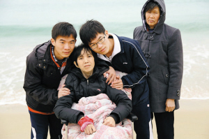 覃小諜和母親及兩個(gè)兒子在海邊合影。