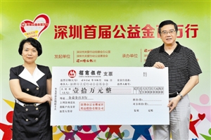 深圳特區(qū)報(bào)總編輯陳寅(右)代表“公益金百萬(wàn)行”主辦方從陳國(guó)紅(左)手中接過十萬(wàn)元支票。深圳特區(qū)報(bào)見習(xí)記者 何龍 攝