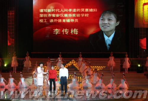 李傳梅,深圳市展華實驗學校職工兼德育輔導員。十多年來,李傳梅任勞任怨侍奉年邁的太婆婆、身患癌癥的公公和雙目失明又聾啞癱瘓的婆婆。盡管生活貧困,但她對老人始終不離不棄,就連出門打工也把婆婆背在身上。李傳梅用她的無私付出詮釋了當今社會的大賢大孝,被全國婦聯負責人譽為“全國婦女學習的好榜樣”。李傳梅的事跡經媒體報道后廣為傳頌,被譽為“當代孝媳”。她先后被授予“全國道德模范提名獎”、“廣東省道德模范”、“深圳市文明市民”等稱號。2009年,李傳梅落戶寶安區龍華街道,從最初的一名來深建設者成為深圳的戶籍居民。在展華實驗學校擔任輔導員期間,李傳梅身體力行,言傳身教,深受學生愛戴。 2009年,李傳梅獲得第六屆深圳關愛行動的愛心大使的榮譽稱號,在十幾年的漫長日子里,她以一顆仁孝大愛之心和無私奉獻的情懷支撐起一個特困家庭幸福的藍天。 “大愛至簡”,李傳梅因為愛丈夫,而愛父母、愛家人,體現了中華民族傳統美德。李傳梅的事跡,如今已成了德育工作的活教材。