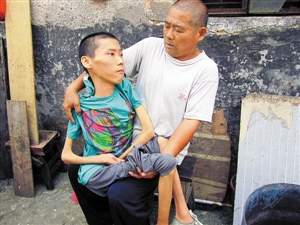 ????現今,王中民每每從工廠做完清潔回來,不管多晚,都會背著兒子出門,他背的姿勢也很獨特,兒子的兩只瘦腳被他夾在腋下,兩手抓著兒子的兩手。“我背習慣了,一點都不覺得他重。”