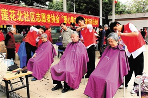 昨日下午,福田區蓮花北社區志愿者協會、萬廈蓮花北村管理處、社區工作站等在中心廣場為社區居民舉辦“愛心集市”志愿者行動。服務人員都是社區的志愿者及愛心醫生們為他們理發、檢查疾病等,受到社區居民的歡迎。