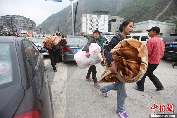 21日傍晚,3名災(zāi)民們抱著被褥前往位于寶興縣中學(xué)的安置點(diǎn)。這個(gè)安置點(diǎn)為數(shù)千名災(zāi)民提供帳篷、食品、飲水和電視娛樂等各類服務(wù)。許云峰攝