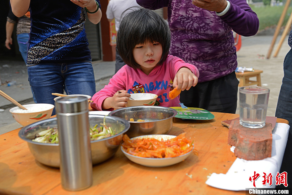 4月21日下午2點,蘆山縣龍門鄉(xiāng)75歲的村民傅玉潤一家,地震以來第一次吃上了大米飯。從4月20日地震發(fā)生以來,傅玉潤家都是吃的方便面和餅干,今天利用自家地里的菜和受損房間里的米做了一餐飯菜。中新社發(fā)張元 攝