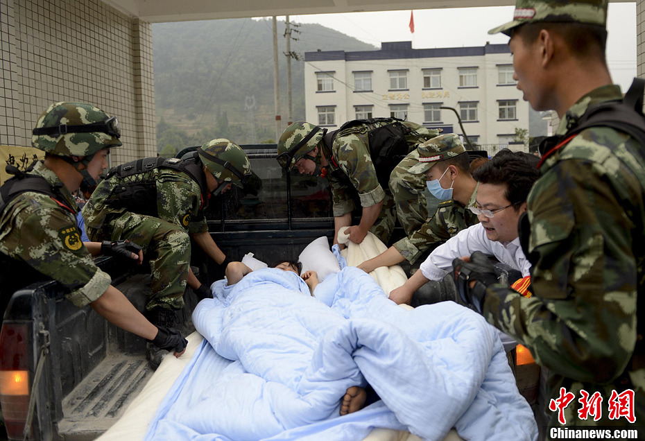 4月21日,四川省雅安市寶興縣靈關(guān)鎮(zhèn)靈關(guān)中學(xué)災(zāi)民安置點戰(zhàn)士轉(zhuǎn)運女傷員。中新社發(fā) 廖攀 攝