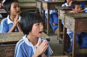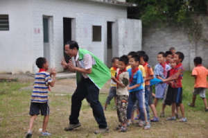 山區學生穿上深圳福田小學學生二手校服和志愿者一起唱歌。