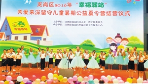 【深圳商報訊】(記者 畢國學 通訊員 招晶晶 陳艷 謝政鋒)6日下午,坂田街道天安云谷D區三樓徜徉在歡樂的海洋中。由龍崗區關工委主辦,深圳市龍崗區至誠社會工作服務中心承辦的“龍崗區關工委2016年‘幸福驛站’”關愛來深留守兒童暑期公益夏令營,結營儀式活動在此舉行,小伙伴們以精彩紛呈的匯報演出為15天的夏令營之旅畫上了圓滿句號。