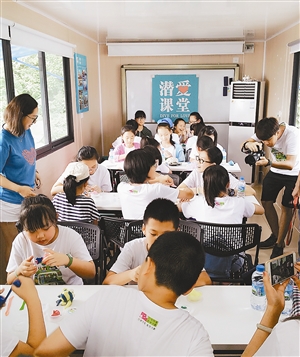 在潛愛(ài)手工坊,學(xué)員們可以用五顏六色的橡皮泥制作自己心中最美的海洋生物:藍(lán)鯨、魔鬼魚(yú)、珊瑚;觀珊瑚,近距離的看見(jiàn)水面之下的珊瑚寶寶長(zhǎng)勢(shì)如何,普及了海洋救生知識(shí)和海洋豐富的物種;走沙灘,親眼觀察、觸摸到貝殼等生物,體驗(yàn)鮮活的海洋生物保育知識(shí),了解到人類(lèi)與海洋是命運(yùn)共同體。