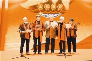 老人們在臺上進(jìn)行合唱表演。