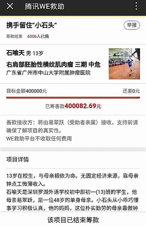 10日9:25,羅外初中部負(fù)責(zé)人肖繼宏從“騰訊WE救助”平臺上看到“該項(xiàng)目已結(jié)束籌款”幾個(gè)字,感到既驚訝又欣慰——沒想到為救“小石頭”而發(fā)起的網(wǎng)絡(luò)籌款僅僅13個(gè)多小時(shí)就達(dá)到了目標(biāo)數(shù)額。