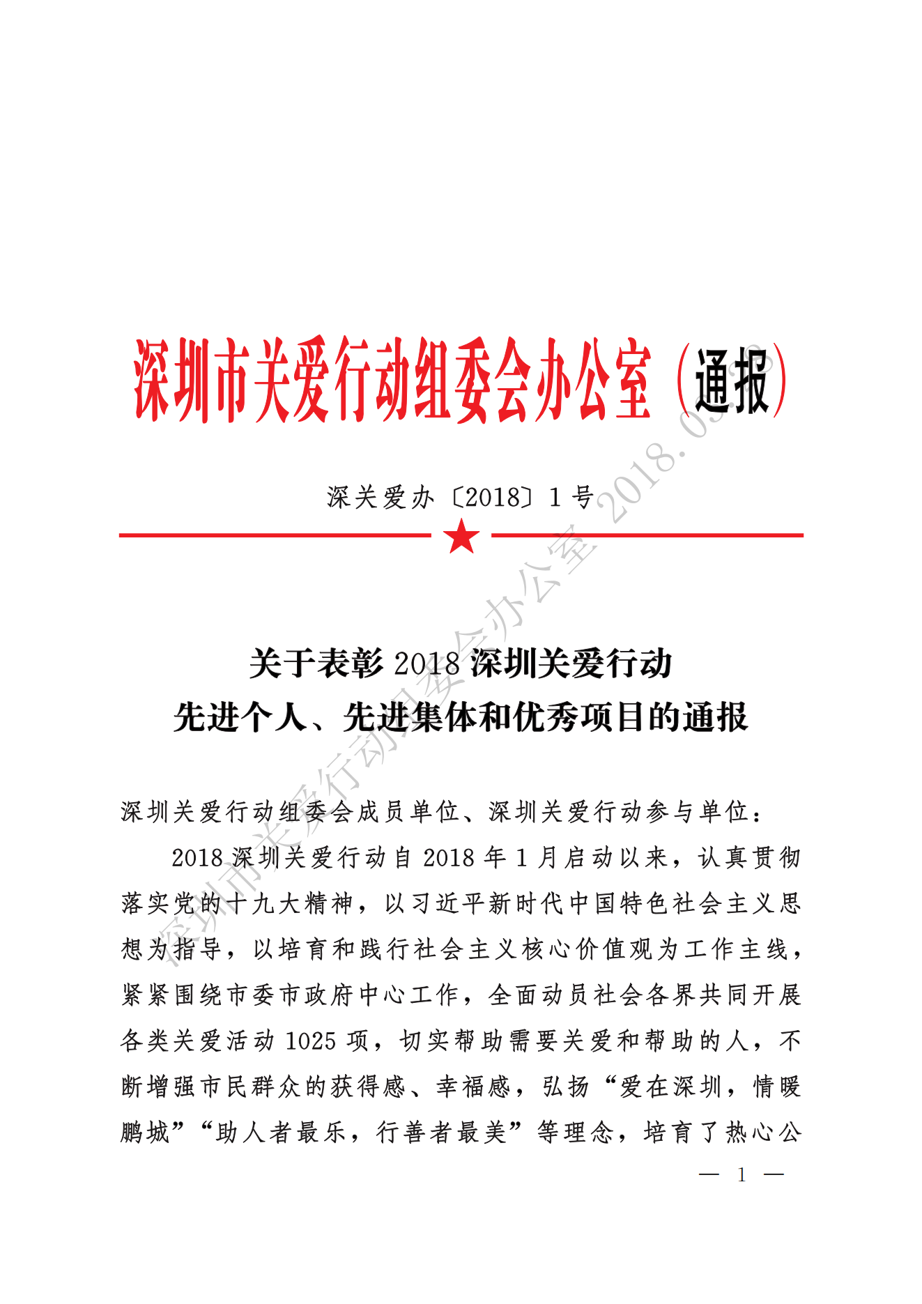 關(guān)于表彰2018深圳關(guān)愛行動先進(jìn)個人、先進(jìn)集體和優(yōu)秀項目的通報