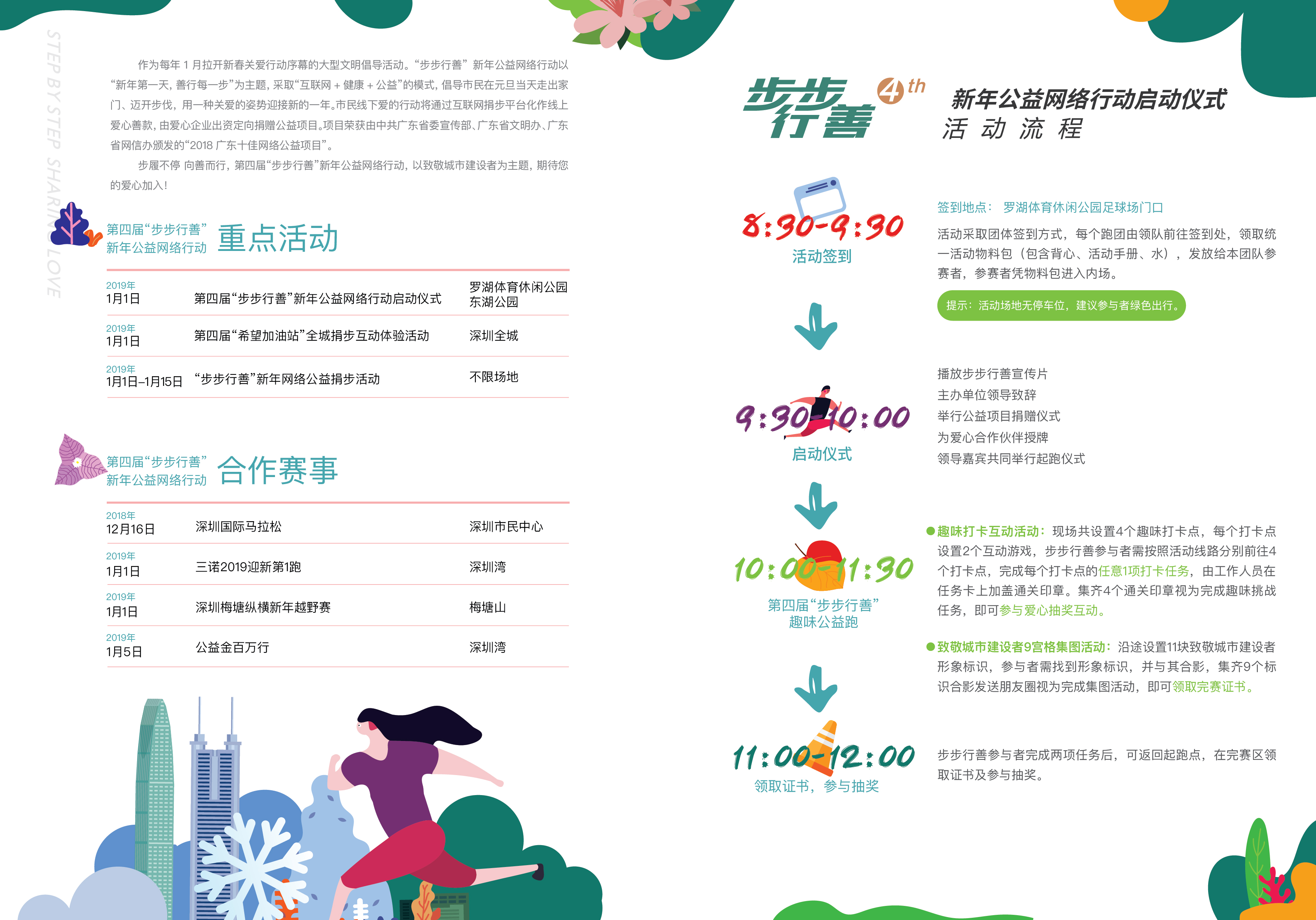2019年1月1日上午,由深圳市文明辦、深圳市關愛辦主辦,羅湖區文化體育局、羅湖區文明辦、深圳晚報社、悅動圈承辦的“步步行善”第四屆深圳新年公益網絡行動在羅湖體育休閑公園啟動,并以此為標志,在全市范圍啟動2019新春關愛行動。該活動倡導“新年第一天、善行每一步”,動員廣大市民步履不停、向善而行,以捐贈步數的方式為關愛項目籌款,向為改革開放和城市發展作出貢獻的建設者表達敬意。