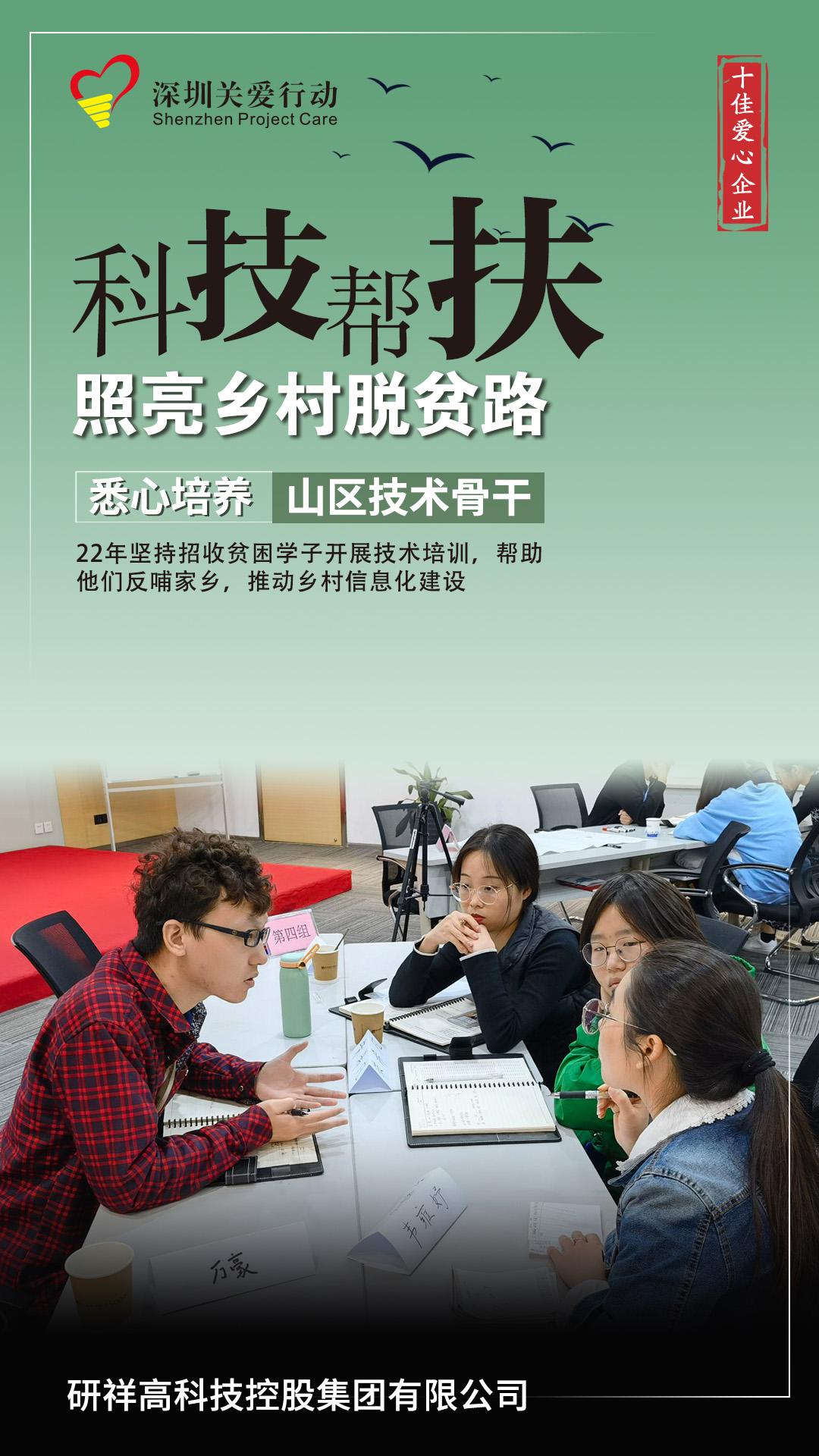 研祥集團(tuán)堅(jiān)持參加社會(huì)公益事業(yè)和扶貧工作,從1999年至今,每年招收數(shù)十名來自廣東東源縣、廣西梧州、河南蘭考縣等地區(qū)因貧困未能考取大學(xué)的青年學(xué)生,到集團(tuán)接受設(shè)計(jì)技術(shù)專業(yè)的公益培訓(xùn),授之以漁,使他們掌握相關(guān)技能之后,回鄉(xiāng)成為當(dāng)?shù)丶夹g(shù)骨干并帶動(dòng)當(dāng)?shù)匦畔⒒ㄔO(shè)發(fā)展。