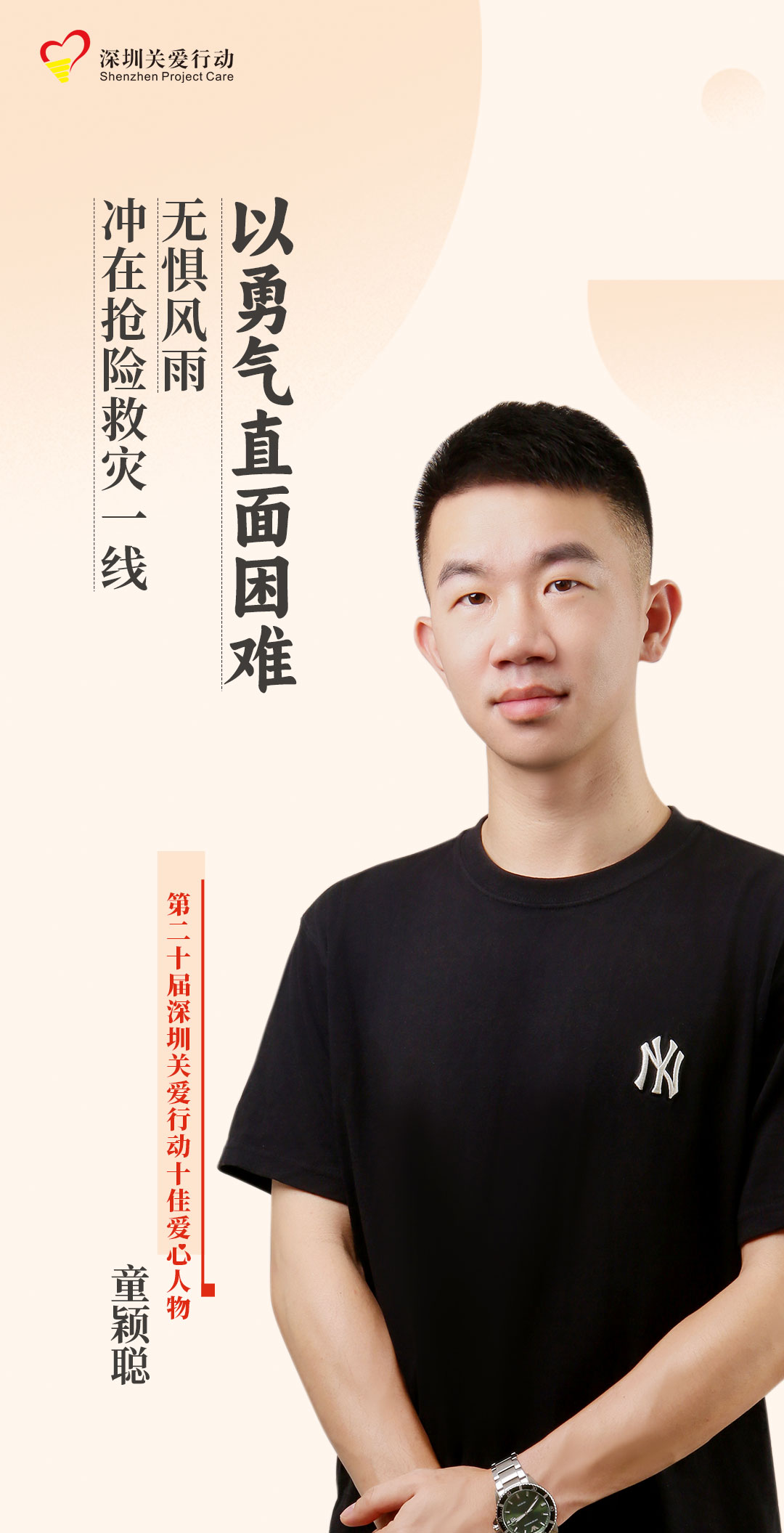 童穎聰是深圳市光明區鳳凰街道辦事處應急管理辦公室人武部專輔,光明區退役軍人紅星志愿服務隊成員。他曾在服役期間榮獲團隊、個人各類立功表彰5次,退役后先后擔任深圳市光明區鳳凰街道民兵連副連長、政治指導員兼黨支部書記,曾分別獲深圳警備區防汛抗洪民兵骨干集訓和深圳警備區民兵干部骨干集訓單兵戰術基礎考核第一名,并擔任深圳市光明區民兵防汛抗洪沖鋒舟橡皮艇集訓總教官。