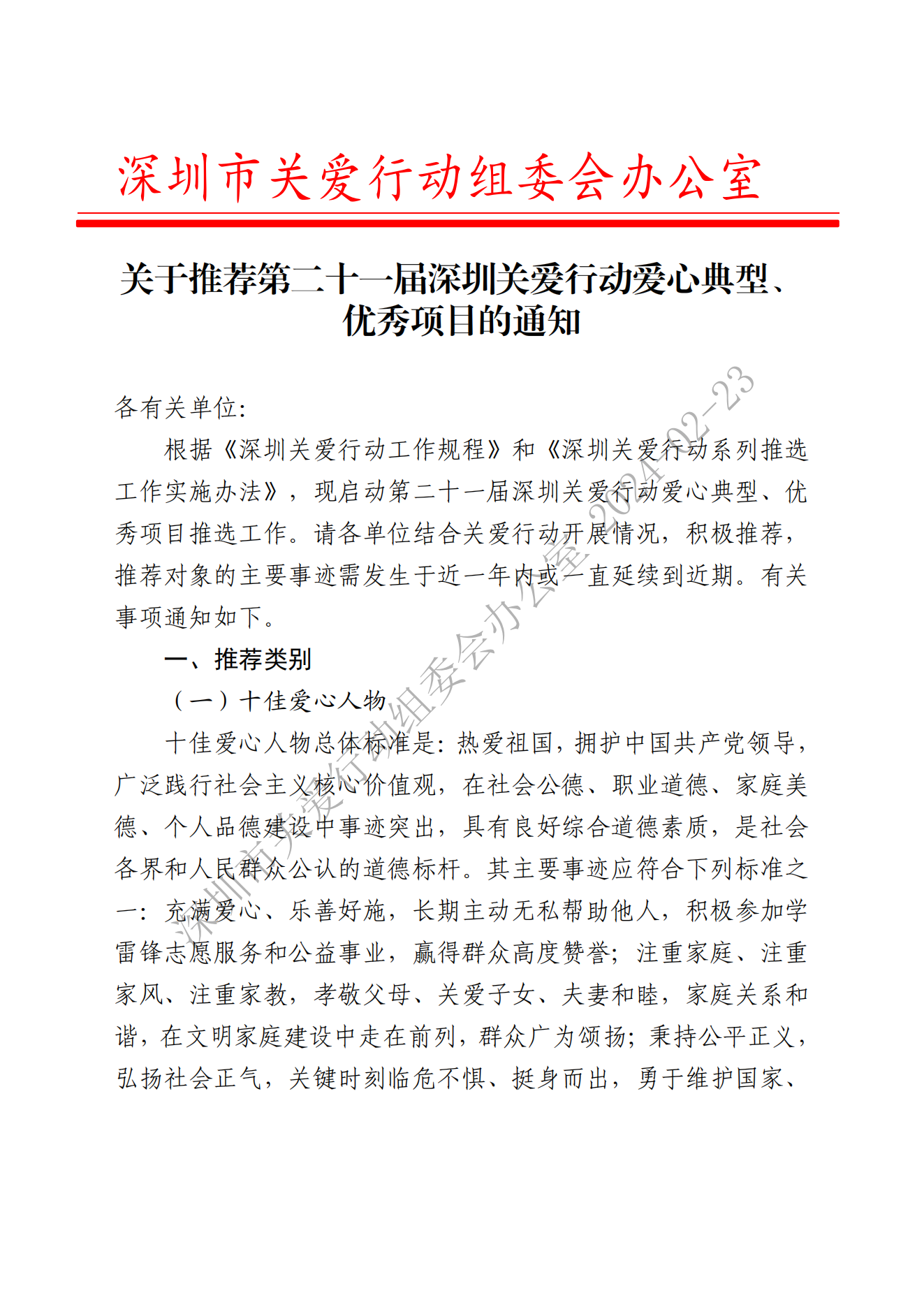 關于推薦第二十一屆深圳關愛行動愛心典型、優秀項目的通知