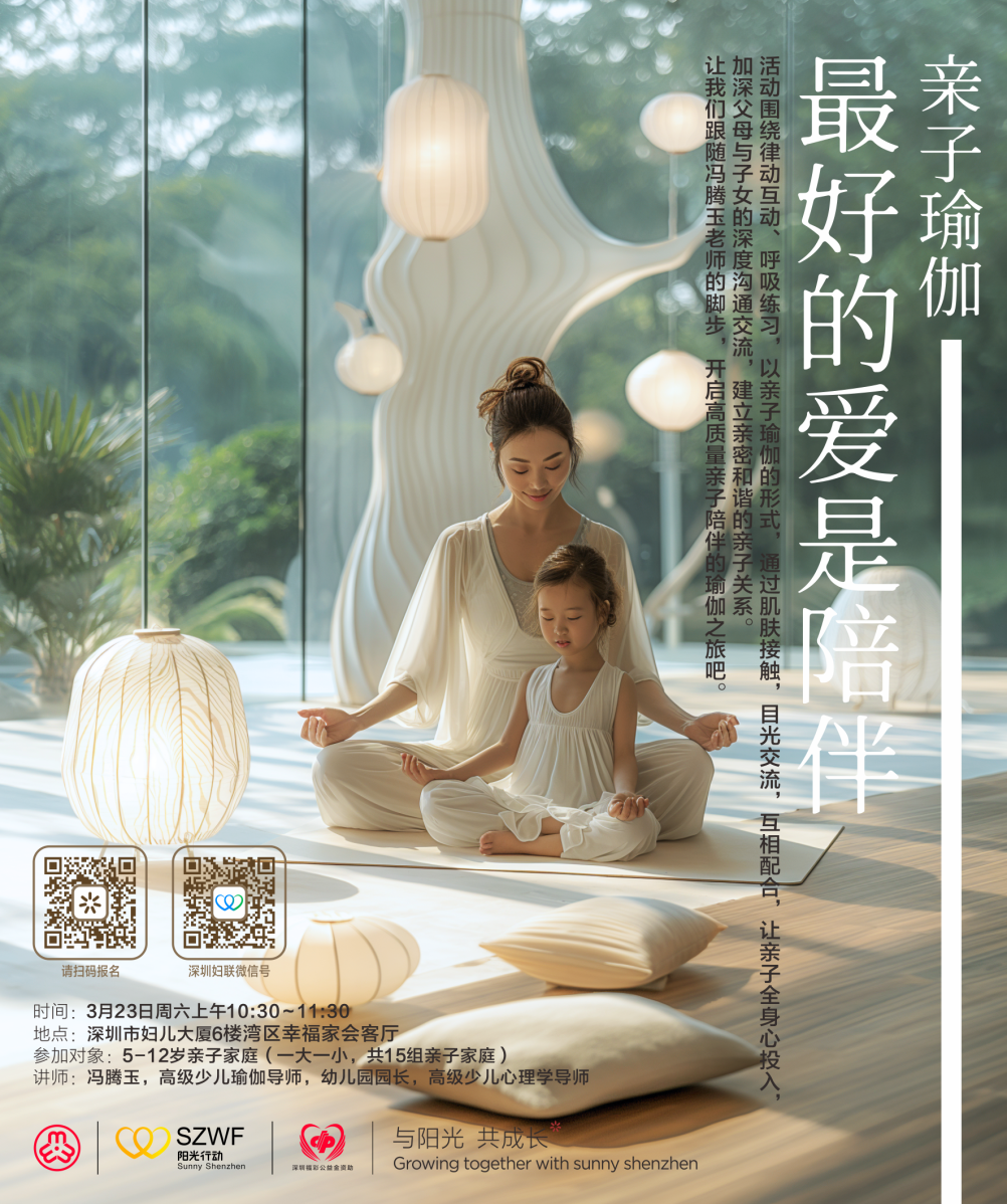 活動簡介:肌膚接觸、目光交流、呼吸調節、律動配合,在親子瑜伽中加深父母與子女的溝通交流,建立親密和諧的親子關系。這個周六,讓我們和馮騰玉老師一起開啟高質量親子陪伴的瑜伽之旅吧。