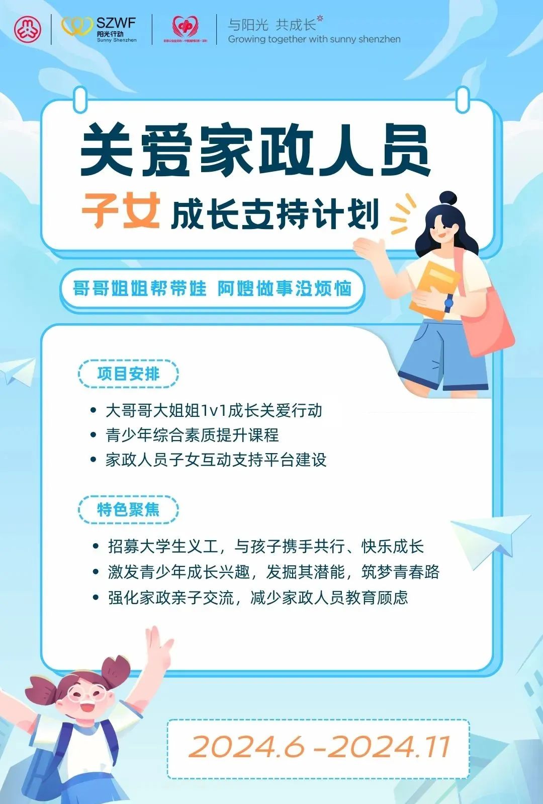 活動簡介:隨著社會的發展和人們生活節奏的加快,家政服務已經成為越來越多家庭的需求,家政人員為我們的生活提供便利的同時他們的子女卻因為父母的工作繁忙而缺乏陪伴和關注。為此,深圳市婦聯發起關愛家政人員子女成長支持計劃,通過招募大學生志愿者為全市100個家政人員子女提供關愛成長服務。