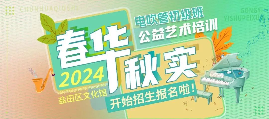 活動簡介:深圳市鹽田區文化館已成功開辦多期電吹管零基礎公益培訓課,為熱愛電吹管的人群開啟了一扇通往音樂藝術殿堂的大門。為了滿足更多音樂愛好者的學習熱情,鹽田區文化館將增設“春華秋實”電吹管初級班公益培訓課。