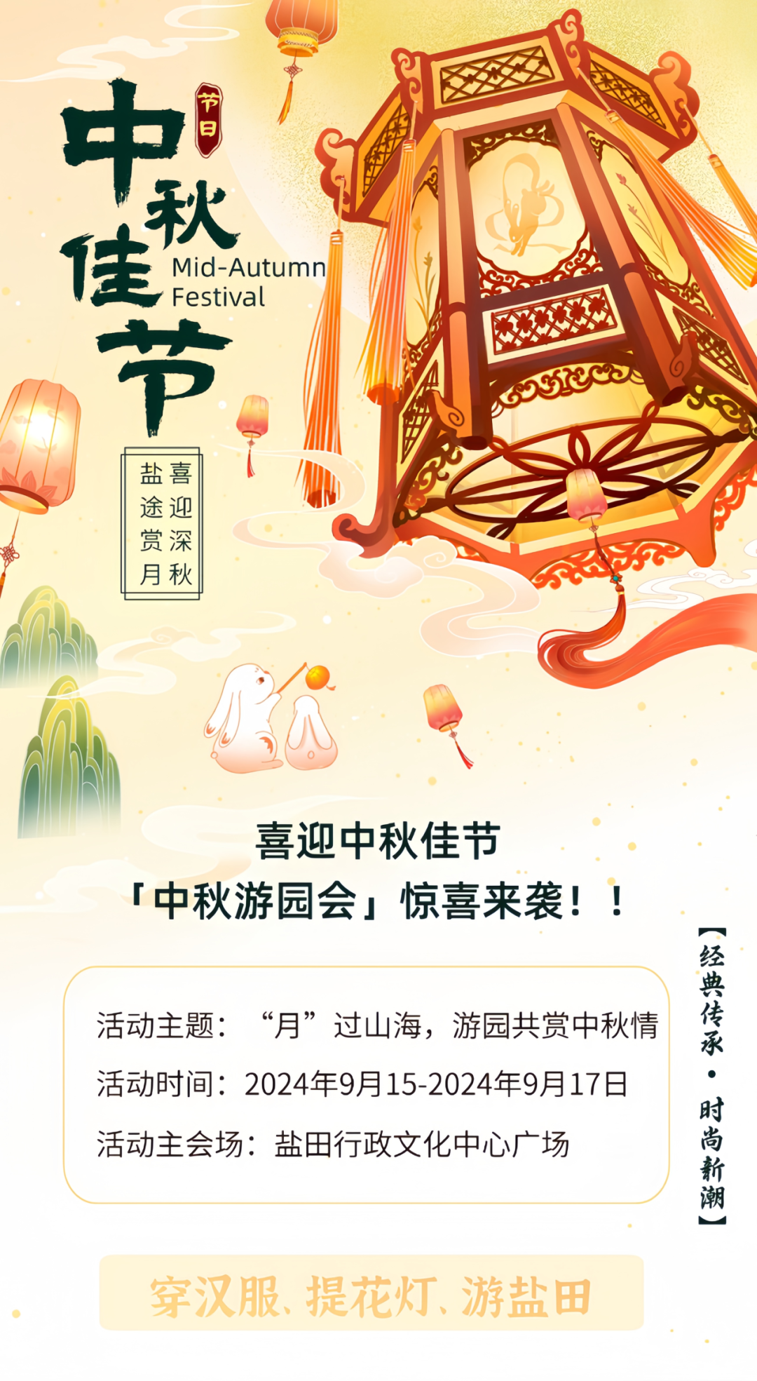 活動簡介:中秋活動精彩紛呈,包括漢服巡游、花燈游園、風箏嘉年華、非遺花燈展演等。9月15日至17日,漢服愛好者將身著華服,手提特色花燈巡游鹽田。同時,還有漢舞快閃、漆扇制作、投壺游戲等互動體驗。此外,還有越劇《孟麗君》演出、弦樂音樂會、中秋彩燈嘉年華等文化活動。活動覆蓋鹽田多個熱門地點,如中英街、小梅沙等,誠邀市民共赴這場古風盛宴。
