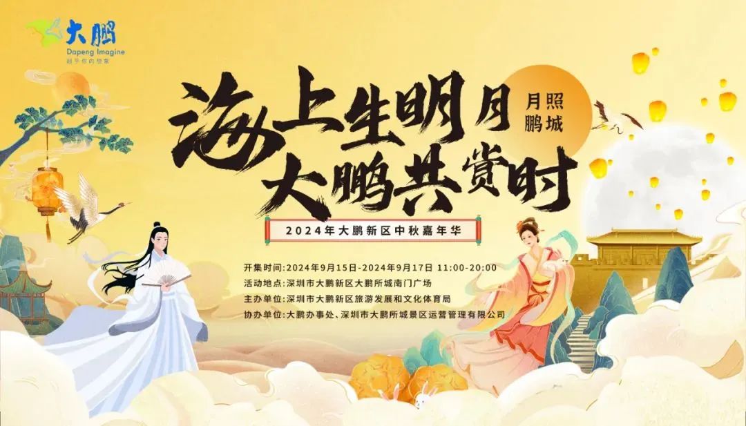 活動簡介:2024年大鵬新區中秋嘉年華活動即將于9月15日至17日舉行。活動包含古風集市、海邊音樂會、換裝體驗及祈福互動等環節。游客可漫步六百年大鵬古城,參與花燈手繪、月餅制作等文化體驗,更有音樂會與海灘集市等你享受。