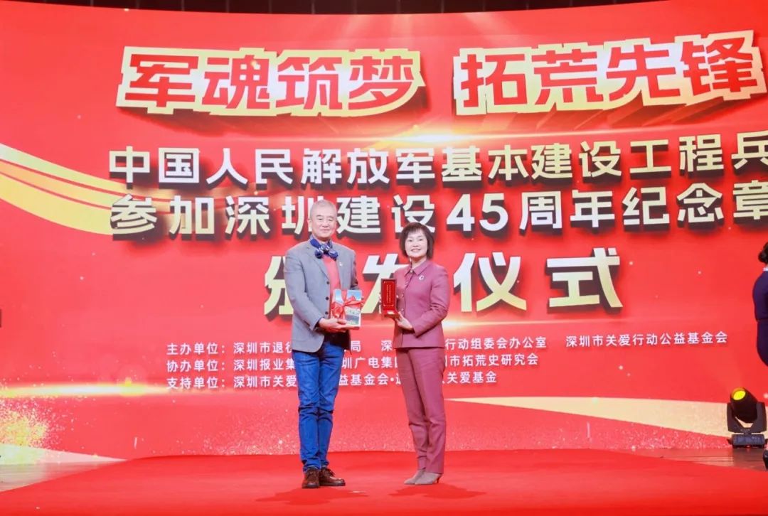 活動現場還舉行了紀念章及書籍捐贈儀式。深圳市關愛行動公益基金會理事長張占恒代表主辦單位,將眾多記錄深圳基建工程兵拓荒筑城歷史的文學作品《榮光與夢想》、《拓荒牛的記憶》以及《基建工程兵·深圳傳奇》紀錄片,連同“基建工程兵參加深圳建設45周年”紀念章一并捐贈給深圳黨史館,將基建工程兵們鑄就的豐功偉績和傳承的拓荒牛精神永載史冊,以激勵一代代深圳人奮勇前行!